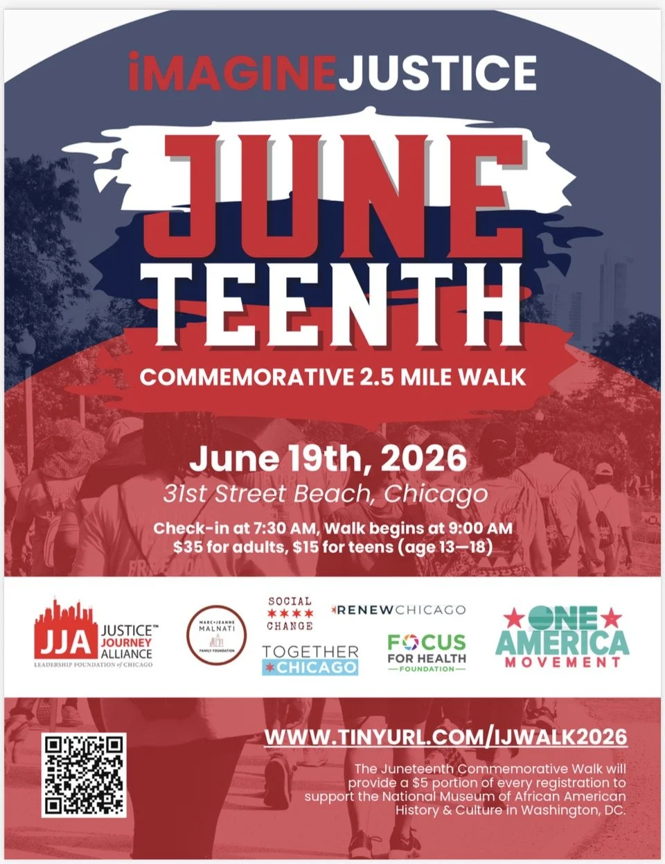 The Justice Journey Alliance, Leadership Foundation of Chicago (JJALFOC), invites you to the 2nd annual Imagine Justice Juneteenth Commemorative Walk on Friday, June 19, 2026. This 2.5-mile walk begins at 31st Street Beach, proceeds north to 18th Street, and returns via the Lakefront Trail. The distance honors the 2.5-year delay in freedom reaching the last enslaved people in Texas following the Emancipation Proclamation. A portion of each registration supports the National Museum of African American History and Culture.